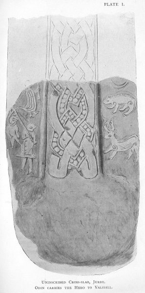 We are now able, by means of the old Norse Mythology, to explain a strange figure on an uninscribed fragment from Jurby. To understand it aright we must bear in mind that Odin is ever eager to bring the greatest champions to Valhall to share in the joyous lives of the gods, and to be ready at the great Day of Doom to sally forth with them and do battle with the monsters and the demons. We must remember, too, that it is by hanging a man is dedicated to Odin.