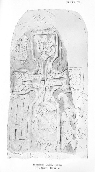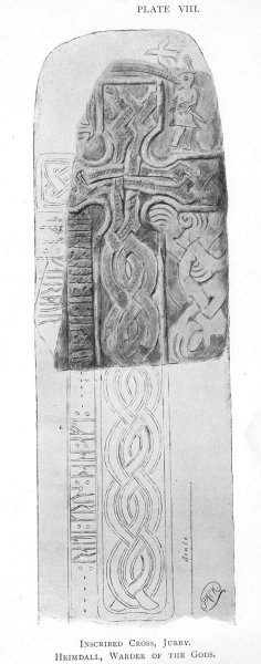 A fragment at Jurby (pl. VIII.) shows on one face,. above the right arm of the cross, a figure of a Man in a tunic with a row of large buttons; in his left hand a short, pointed sword, his right holding to his mouth a long Alpine horn (Lur). On his head is a curious helmet, above the horn a flying raven.