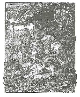 After awhile comes another monkey and puts his paw in the pan. He smacked him too and said the same. But the rope-dancer had a bear, too, which was lying under the table all the time; and, when he heard the Waternick speak, he came from under the table, ran straight to the pan, and put his