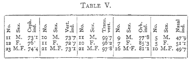 Out of the 29 crania of the upper series only 5 were sub-brachycephalous. Taking both sexes together—in Table IV. they are given separately—the indices were:—