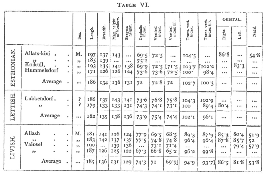 It is now time to pass in review the contents of Tables IV. and VI. to ascertain how far the Finnish type of skull prevails in the northern half of the Baltic Provinces, Beginning with Esthonia, we find that out of 23 adult crania, from seven different places, not one accords with the average Häme type in Table III.; either the cephalic or the vertical index is too low, though the high orbital indices from 86 to 88.1 in some instances are certainly an indication of Finnish rather than of Lettish origin. Yet on that account alone we are not to suppose that the owners of these crania, when alive, did not speak a Finnish dialect. In all probability they did so; at any rate most of them. With regard to the 4 crania from Pühtitsa, which lies near the Russian frontier, Dr. Kharuzin, who measured them, is almost sure they could not have belonged to a Finnish people, and Professor Viskovatov, who conducted the excavations, says there is no doubt, judging from their family names, that the present inhabitants are Esthonianised Russians. 2 The high orbital index of the Hallist group may perhaps be attributed to crossing with Finns, while that of the Fellin triplet is low—rather lower, in fact, than the average Lettish male orbital index in Table V. That miscegenation on a great scale between Finns and a long-headed orthocephalous population, like the Letts, has taken place, seems quite evident.