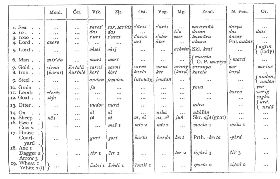 [paragraph continues] Ostiaks had learned to count up to a thousand some 2500 years ago, their arithmetical ideas should still be so hazy; a single word does duty for 80 and 800, another for 90 and 900. A thousand, therefore, can seldom be used except as a round number, and perhaps was never more than that. In the last chapter I made a rough calculation that the West Finnish and Mordvin words for '10' may have originated about 500 B.C., but if they borrowed a term for '100' between 600 and 700 B.C. the '10'-word must be still older. On line 5 Dr. Munkácsi traces the Permian words for 'lord, master' to a Skolotan or Scythian ksai, preserved by Herodotus in the words Leipo-xais, Arpo-xais the old Bactrian equivalent of which is khšaya 'powerful, master' from khši 'to rule.' In Hübschmann's opinion the connection between Zịr. khši and Os. äχsīn 'a lady' is very problematical, so the equation of the Permian words with an Osetan or Scythian form is not thoroughly established, though the identification is attractive. The words for 'gold' in line 7 are evidently a good deal later than those in line 1, 3, 4, for now the initial O. B. z is reproduced as s, z not by š, as the older aspirated ž, from which z originated, would lead us to expect. A term for 'iron' came into use about the same time no doubt; and the new metal was introduced in the form of a 'knife or short sword,' for that is the meaning of the O. B. kareta, from which are derived most of the East Finnish and Ugrian terms for 'iron.' The Magyars have retained the original sense of the word, but the Mordvins, more peaceably inclined, have turned the sword into a 'plough-share.' The latter have a special word for 'iron,' kšn´ä which may have an East Persian origin. In the Pamir dialects we find išn, spin 'iron'; an older form of the first would be