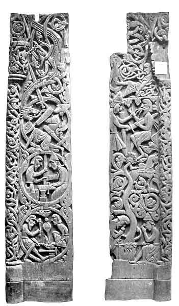 Carved with scenes from the Volsung Saga. Sigurd is shown with his thumb in his mouth at the bottom of the left portal