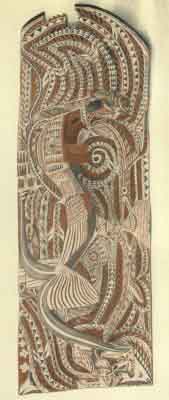 Carved and painted board with figures of a bird and of fish. These figures refer to guardian spirits or clan totems, the boards being used for the decoration of the mask-houses, in which the sacred masks used in ceremonials are kept, and where many of the ceremonies themselves are held. New Ireland. Original in American Museum of Natural History, New York City.