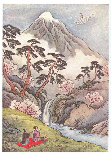 One day, when celebrating this event at a picnic, Okureha gave her husband some of the furoshu saké, and took the rest herself, as the goddess had bidden her. They were sitting on a beautiful green grassy spot, whereon grew wild violets of delicious fragrance; at their feet gurgled a mountain stream of sparkling clearness. To their surprise, they found petals of cherry blossom suddenly falling all round them. There were no cherry trees near, and at first they were much puzzled; but they saw in the blue sky one white cloud which had just sailed over them, and seated thereon was the Goddess of Mount Daimugenzan. Okureha recognised her, and pointed her out to her husband as their benefactress. The white cloud carried her up to the top of the mountain, where it hovered until the shades of evening hid it.