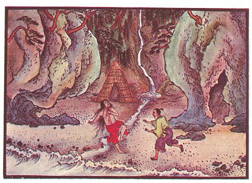 Strolling along the shore, he met a girl, tanned by sun and wind. She wore only a red cotton cloth about her loins, and her hair fell upon her shoulders. She had been gathering shell-fish, and had a basket of them under her arm. Sawara thought it strange that he should meet a single woman in so wild a place, and more so still when she addressed him, saying, 'Surely you are Sawara Kameju—are you not?'
