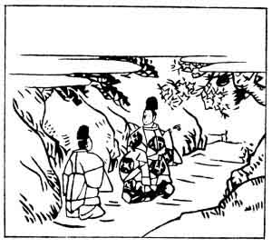 Masafusa with his attendant appears in the illustration admiring the cherry trees on the mountains, over which, however, the clouds are already beginning to gather.