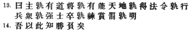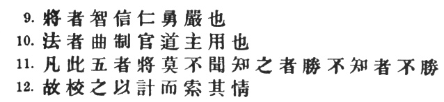 3:3 The Yü Lan has an interpolated # before #. It is obvious, however, that the # just enumerated cannot be described as #. Capt. Calthrop, forced to give some rendering of the words which he had omitted in § 3, shows himself decidedly hazy: "Further, with regard to these and the following seven matters, the condition of the enemy must be compared with our own." He does not appear to see that the seven queries or considerations which follow arise directly out of the Five heads, instead of being supplementary to them.