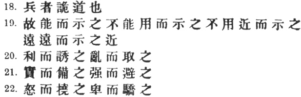 7:3 This seems to be the way in which Ts‘ao Kung understood the passage, and is perhaps the best sense to be got out of the text as it stands. Most of the commentators give the following explanation: "It is impossible to lay down rules for warfare before you come into touch with the enemy." This would be very plausible if it did not ignore #, which unmistakably refers to the maxims which Sun Tzŭ has been laying down. It is possible, of course, that # may be a later interpolation, in which case the sentence would practically mean: "Success in warfare cannot be taught." As an alternative, however, I would venture to suggest that a second # may have fallen out after #, so that we get: "These maxims for succeeding in war are the first that ought to be imparted."