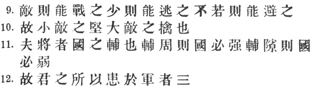 9. If equally matched, we can offer battle; 1 if slightly inferior in numbers, we can avoid the enemy; 2 if quite unequal in every way, we can flee from him.