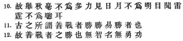 29:3 The original text, followed by the T‘u Shu, has #. But this is an alteration evidently intended to smooth the awkwardness of #, which means literally: "one who, conquering, excels in easy conquering." Mei Yao-ch‘ên says: "He who only sees the obvious, wins his battles with difficulty; he who looks below the surface of things, wins with ease."