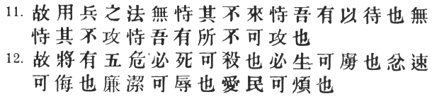 72:3 See XI. §§ 10, 14. Chang Yü has an important note here, which must be given in full. "From #," he says, "down to this point, the Nine Variations are presented to us. The reason why only five are given is that the subject is treated en précis (#). So in chap. XI, where he discusses the variations of tactics corresponding to the Nine Grounds, Sun Tzŭ mentions only six variations; there again we have an abridgment. [I cannot understand what Chang Yü means by this statement. He can only be referring to §§ 11–14 or §§ 46–50 of chap. XI; but in both places all the nine grounds are discussed. Perhaps he is confusing these with the Six # of chap. X.] All kinds of ground have corresponding military positions, and also a variation of tactics suitable to each (#). In chap. XI, what we find enumerated first [§§ 2–10] are the situations; afterwards [§§ 11–14] the corresponding tactics. Now, how can we tell that the # "Nine Variations" are simply the # "variations of tactics corresponding to the Nine Grounds"? It is said further on [§ 5] that 'the general who does not understand the nine variations of tactics may be well acquainted with the features of the country, yet he will not be able to turn his knowledge to practical account.' Again, in chap. XI [§ 41] we read: 'The different measures adapted to the nine varieties of ground (#) and the expediency of aggressive or defensive tactics must be carefully examined.' From a consideration of these passages the meaning is made clear. When later on the nine grounds are enumerated, Sun Tzŭ refers to these nine variations. He wishes here to speak of the Five Advantages [see infra, § 6], so he begins by setting forth the Nine Variations. These are inseparably connected in practice, and therefore they are dealt with together." The weak point of this argument is the suggestion that # "five things" can stand as a #, that is, an p. 73 abstract or abridgment, of nine, when those that are omitted are not less important than those that appear, and when one of the latter is not included amongst the nine at all.
