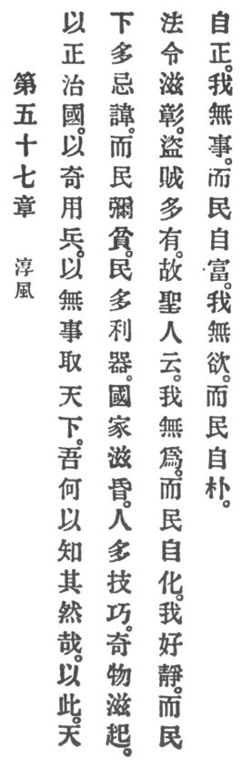 3. Therefore the holy man says: I practise non-assertion, and the people of themselves reform. I love quietude, and the people of themselves become righteous. I use no diplomacy, and the people of themselves become rich. I have no desire, and the people of themselves remain simple.