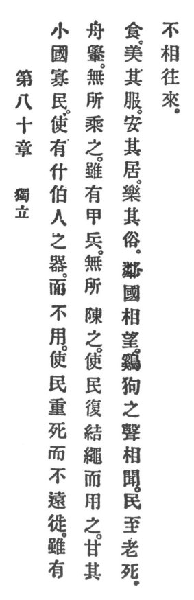 1. In a small country with few people let there be aldermen and mayors who are possessed of power over men but would not use it. Induce people to grieve at death but do not cause them to move to a distance. Although they had ships and carriages, they should find no occasion to ride in them. Although they had armours and weapons, they should find no occasion to don them.