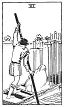 A ferryman carrying passengers in his punt to the further shore. The course is smooth, and seeing that the freight is light, it may be noted that the work is not beyond his strength. Divinatory Meanings: journey by water, route, way, envoy, commissionary, expedient. Reversed: Declaration, confession, publicity; one account says that it is a proposal of love.