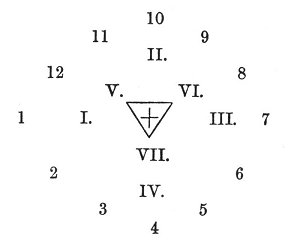 6. Shuffle these seven cards, and when the Inquirer has cut them, take the three top cards, and without looking at them arrange them in a triangle, in the following order--