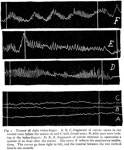 One hour later, after dinner: dynamometer 22, 22, 19average, 21; algesiometer, 20, 18 for the right: 15, 20 for the left. It is possible, then, to say that her muscular force and sensibility to pain, both normal immediately before her entrance upon the seance, are still abolished in the first fifteen minutes after awaking, but are found to be restored in about an hour. Perception of colors, on the contrary, appeared to be as perfect immediately after awaking as before the seance. The tremor of the index-finger; normal before the seance, is very much exaggerated in its amplitude for a certain time after awaking and reflects sometimes the respiratory movements, as can be seen by the curves of Fig. 2. This denotes a great diminution of kinesthetic sensibility and of voluntary control over the immobility of the hand.