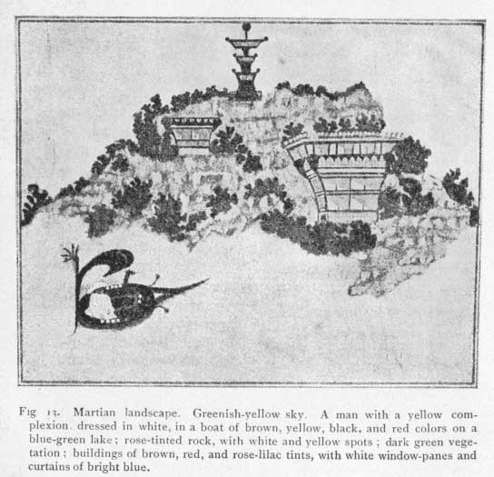 Fig 13. Martian landscape. Greenish-yellow sky. A man with a yellow complexion. dressed in white, in a boat of brown, yellow, black, and red colors on a blue-green lake; rose-tinted rock, with white and yellow spots; dark green vegetation; buildings of brown, red, and rose-lilac tints, with white window-panes and curtains of bright blue. |