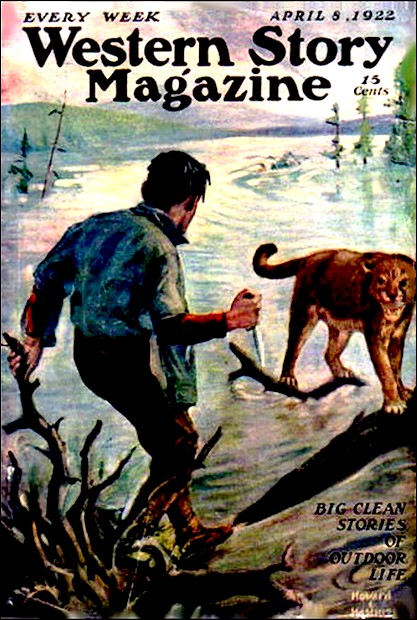 There was a yell from Arizona, not of pain, but of rage. They saw his gun glistening in his hand, and, swerving his horse to disturb the aim of the marksman, his weapon's first report blended with the second shot from the bushes, a tongue of darting flame. Straight at the flash of a target Arizona had fired, and there was an answering yell. Out of the dark of the shrubbery a great form leaped, with a grotesque shadow beneath it on the moon-whitened ground.