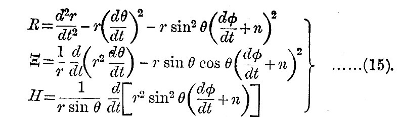 Let r, θ, φ be the radius vector, co-latitude, and east longitude of a point with reference to an origin, a polar axis, and a zero-mendian rotating with a uniform angular velocity n from west to east. Then, if R, H, Ξ be the radial, co-latitudinal, and longitudinal accelerations of the point, we have