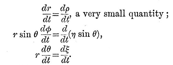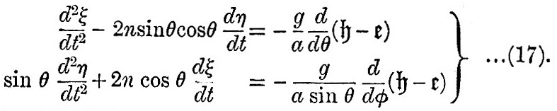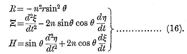 With regard to the first equation of (16), we observe that the time has disappeared, and that R has exactly the same form as if the system were rendered statical by introducing a potential and annulling the rotation of the axes. Since inertia plays no sensible part radially, it follows that, if we apply these expressions to the formation of equations of motion for the ocean, the radial motion need not be considered. We are left, therefore, with only the last two equations of (16).