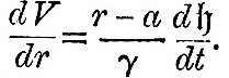 We now have to consider the forces by which an element of the ocean is urged in the direction of co-latitude and longitude. These forces are those due to the external disturbing forces and to the pressure of the surrounding fluid, the attraction of the fluid on itself being supposed negligible. We have seen in (9) that, if fluid on a sphere of radius a be under the action of disturbing forces whose potential is Ur2, and if be the equation to the surface, then must . Hence, if be the equilibrium height of tide, the potential of the disturbing force is . But, if the elevation be the potential under which it would be in equilibrium is . Therefore, if be the elevation of the tide in our dynamical problem, the forces due to hydrostatic pressure on an element of the ocean are the same as would be caused by a potential . Hence it follows that the whole forces on the element are those due to a potential . Therefore from (16) we see that the equations of motion are