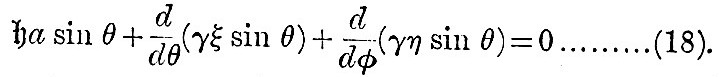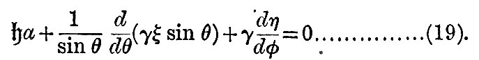 This is the equation of continuity, and, together with (17), it forms the system which must be integrated in the general problem of the tides. The difficulties in the way of a solution are so great that none has hitherto been found, except on the supposition that γ, the depth of the ocean, is only a function of latitude. In this case (18) becomes
