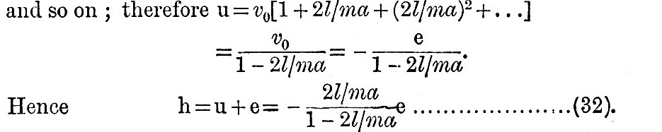 Next let us consider the semi-diurnal tide in the case where q = 1, so that γ = l sin2 θ. Then e = E sin2 θ, k = 2 , f = 1 ; also υ 0 = – e = – E sin2 θ. Hence by (28) and (26) – 8lυ0 + 4mlυ1 = 0, whence υ1 = 2/mυ0. Applying the same theorem a second time, υ2 = (2/m)2 υ0,