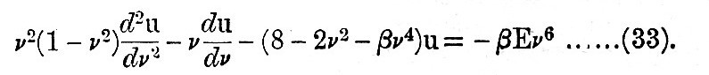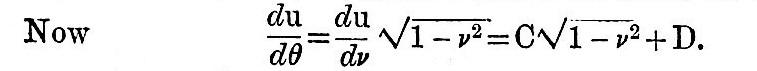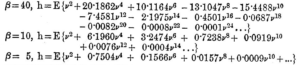 The method of development used above, where we proceed by powers of the depth of the ocean, is not applicable where the depth is uniform, because it leads to a divergent series. We have therefore to resume equation (24). In the case of the semi-diurnal tides we have for the depth γ = l (a constant by hypothesis), k = 2, f = 1 approximately, and e = E sin2 θ. Now for brevity let β = 4ma/l, v = sin θ, so that e = Ev2. Then we find that on development (24) becomes