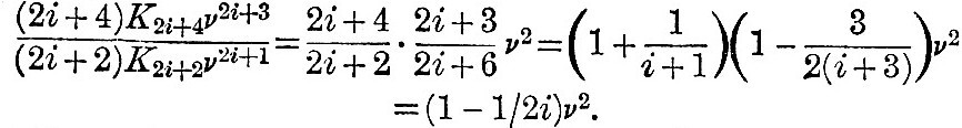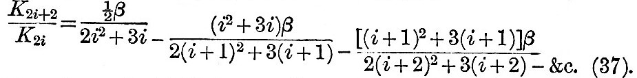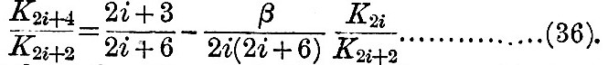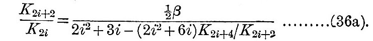Now K2i+2/K2i tends to be either infinitely small or not infinitely small. If it be not infinitely small in the limit, the second term on the right of (36) becomes evanescent when i is very great, and we have in the limit when i is very large