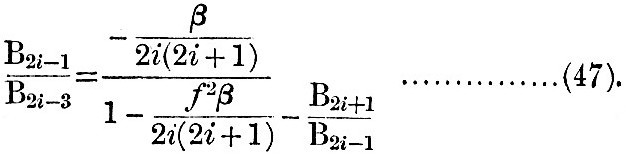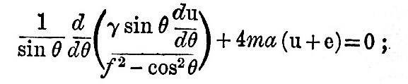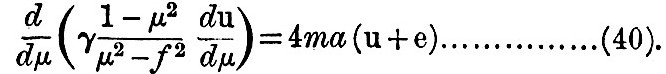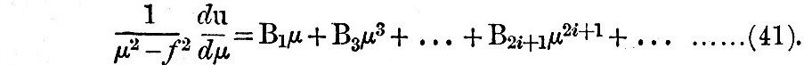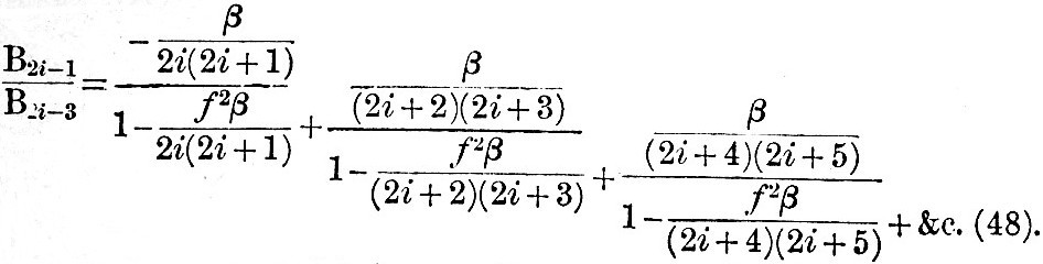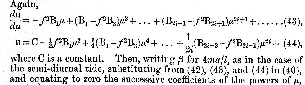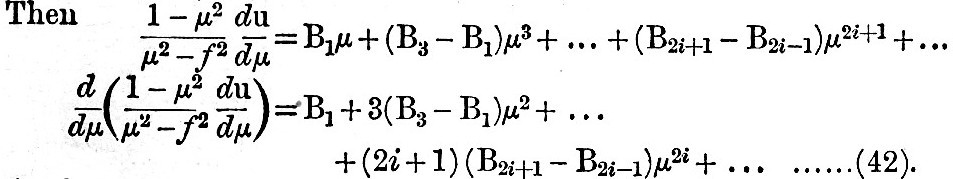When i is large B2i+1/B2i-1 either tends to become infinitely small or it does not do so. Let us suppose that it does not tend to become infinitely small. Then it is obvious that the successive B’s tend to become equal to one another, and so also do the values of (B2i-2-f2B2i-1) /2i and the coefficients of du/dμ. Hence we have du/dμ = L + M/(1-μ2) for all values of μ, where L and M are finite. Hence this hypothesis gives infinite velocity to the fluid at the pole, where μ = 1. But with a water-covered globe this infinite velocity is impossible, and therefore the hypothesis is negatived, and B2i+1/B2i-1 must tend to become infinitely small. This being established, let us write (46) in the form