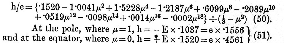 At the pole, where μ = l, we find h = - E x .3137 = e x .471, and at the equator h = + E x .2363 = e x .709. With a deeper ocean we should soon arrive at the equilibrium value for the tide, for N1, N2, &c., become very small, and 2N1/β becomes equal to . In this case, with such oceans as those with which we have to deal, the tides of long period are considerably smaller than the equilibrium value.