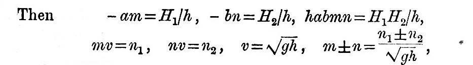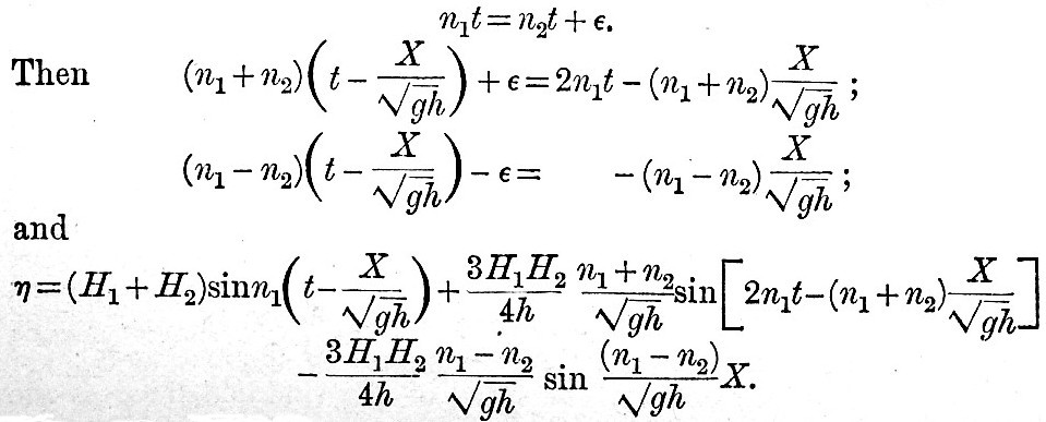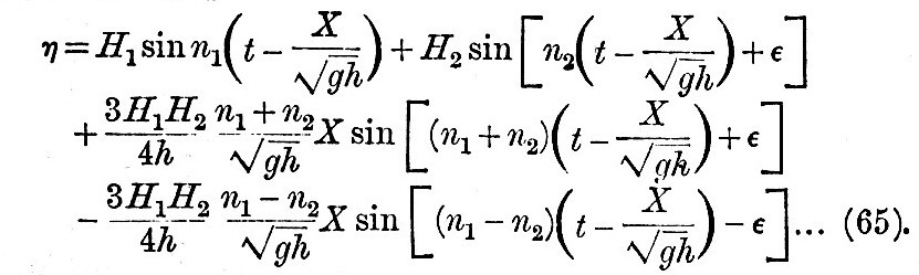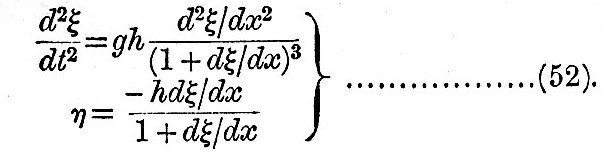 Fig. 1 [Footnote 362-2] read from left to right exhibits the progressive change of shape. The steepness of the advancing crest shows that it is a shorter time from low to high water than vice versa. The law of the ebb and flow of currents mentioned in § 2 may also be easily determined from the above investigation. We leave the reader to determine the effect of friction, which is given by inserting a term - μdξ/dt on the right-hand side of (57).