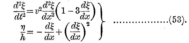 Suppose that the water is contained in a straight and shallow canal of uniform depth; then take an origin of coordinates at the bottom, with the x axis horizontal in the direction of the canal, and the y axis vertical; let h be the undisturbed depth of water; let h + η be the ordinate of the surface corresponding to that fluid whose undisturbed abscissa is x and disturbed abscissa x + ξ ; and let g be gravity. The equations of motion and continuity [Footnote 362-1] are