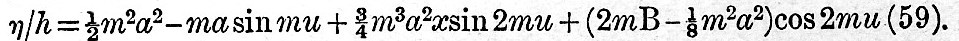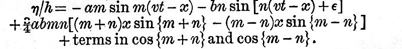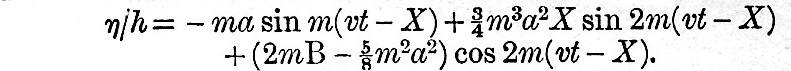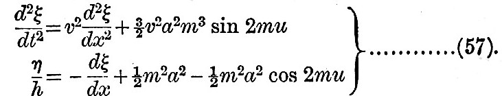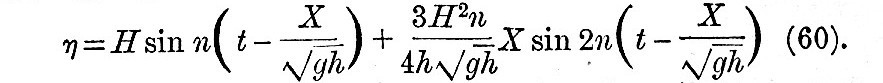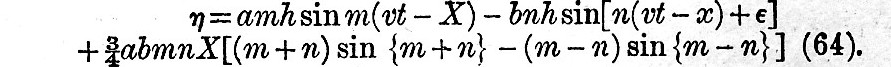 This gives the elevation of the water whose undisturbed abscissa is x, that is to say, at the point whose abscissa along the bank is X = x + ξ. If we put x = X - ξ in the largest term of (59), and treat ξ as small, and put x = X in the small terms, (59) becomes