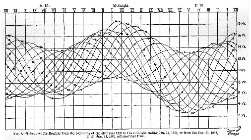 370-1 An example of this kind of curve for the high-water heights for Bombay, drawn automatically by a tide-gauge, would be shown by joining all the high waters together (as in fig. 3) by a continuous curve; and a similar curve may be constructed for the low waters. In this case, however the hours of the clock are repeated twice over, so that the morning and evening tides occur in different halves of the figure, and the hours are not hours of the moon’s transit, but the actual times of high water. It is obvious that the separation of the morning and evening tides prevents the occurrence of the zigzags referred to.