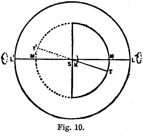 We shall show that if the tidal retardation be small the obliquity of the ecliptic increases, the earths rotation is retarded, and the moons distance and periodic time are increased. Fig. 10 represents the earth as seen from above the south-pole, so that S is the pole and the outer circle the equator. The earths rotation is in the direction of the curved arrow at S. The half of the inner circle which is drawn with a full line is a semi-small-circle of south latitude, and the dotted semicircle is a semi-small-circle in the same north latitude. Generally dotted lines indicate parts of the figure which are below the plane of the paper. It will make the explanation somewhat simpler if we suppose the tides to be raised by a moon and anti-moon diametrically opposite to one another. Let M and M′ be the projections of the moon and anti-moon on to the terrestrial sphere. If the fluid in which the tides are raised were perfectly frictionless, [Footnote 377-5] or if the earth were a perfect fluid or perfectly elastic, the apices of the tidal spheroid would be at M and M′. If, however, there is internal friction, due to any sort of viscosity, the tides will lag, and we may suppose the tidal apices to be at T and T′. Now suppose the tidal protuberances to be replaced by two equal heavy particles at T and T′, which are instantaneously rigidly connected with the earth. Then the attraction of the moon on T is greater than on T′, and that of the anti-moon on T′ is greater than on T. The resultant of these forces is clearly a pair of forces acting on the earth in the direction TM, T′M′. These forces clearly cause a couple about the axis in the equator, which lies in the same meridian as the moon and anti-moon. The direction of the couple is shown by the curved arrows at L,L′. If the effects of this couple be compounded with the existing rotation of the earth according to the principle of the gyroscope, the south pole S tends to approach M and the north pole to approach M′. Hence, supposing the moon to move in the ecliptic, the inclination of the earths axis to the ecliptic diminishes, or the obliquity increases. Next the forces TM, T′M′ clearly produce, as in the simpler case considered above, a couple about the earths polar axis, which tends to retard the diurnal rotation.