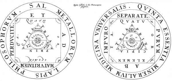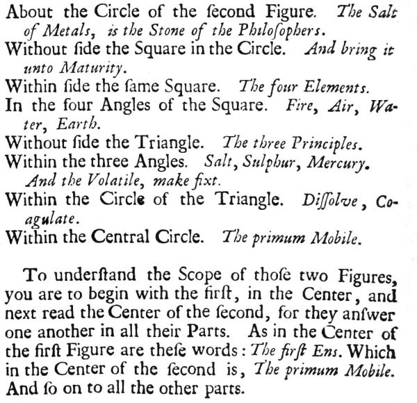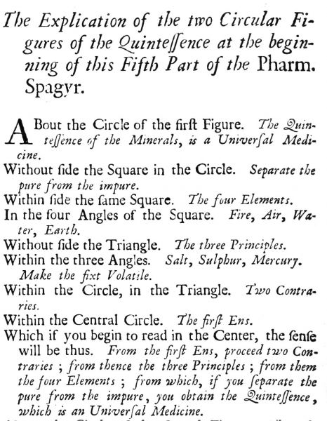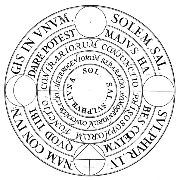 Alchemical Symbolism Abstract emblems of Rudolf Glauber. Back to alchemical symbolism index It is not often that we find an alchemical author providing an explanation, or at least a key, to one of the emblems in his books. This abstract emblem occurs in the English translation of the Works of Rudolf Glauber, published at London in 1689. Although I have not had time to check, it is almost certain that this engraving was re-used from Glauber's original publication in Latin or German of his 'Book of Dialogues'. Glauber writes : In the four principal points of the circle (supposing two transverse lines were drawn, through the center, to the outer circumference) are placed the characters of Sol, Sulphur, Lune, Salt. Round the outmost circle, are placed these words : Conjoin in one, Sol, Salt, Sulpur, Lune. Around the next circle: And thou hast as great a treasure, as Heaven can give thee. Within the third circle : The Philosophers function, is of contraries, the conjunction. Around the next circle : The concentration of Homogeneals, is the separation of Heterogeneals. Within the inmost circle: Sol, Salt, Sulphur, Lune.