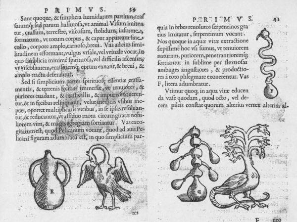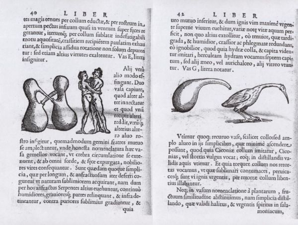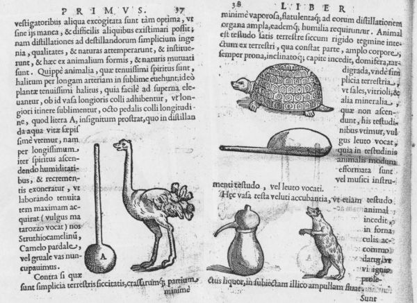 Alchemical Symbolism Woodcuts paralleling animal emblems and apparatus. Back to alchemical symbolism index Following upon the discussion on symbolic and physical alchemy where we saw various emblems being linked to physical laboratory apparatus, there is a well known book by Giambattista della Porta, De distillatione lib. IX., printed in 1608, which has a series of woodcuts paralleling emblematic animals with chemical apparatus. The chapter in which these occur is quite short and if and when I have time I will try and work up a rough translation of the Latin text.