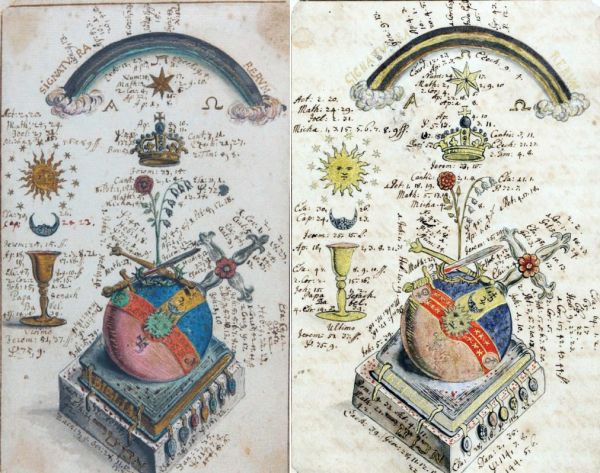 At the bottom we see a stone plinth on which is placed a book with seven seals. It is entitled 'Biblia'. On top of this is an orb topped with a silver cross and red rose. The orb has its lower hemisphere coloured reddish brown, while the upper part is in cerulean blue with little golden stars. The bands around the orb bear the symbols of the seven planets. On top of the orb are a sword and a sceptre set crosswise, at at their intersection is a crown of thorns. From this rises up a red rose on the left and a sprig of the Solomon's Seal plant with its white flowers. Above all this is a golden crown. High in the sky is a rainbow, the 'signatura rerum', together with a seven pointed star, and the Greek letters Alpha and Omega. On the left is a golden chalice with a Moon and Sun. Every symbol bears multiple references to Biblical texts. It would probably throw some light on how to read this image, if one were to list all the Biblical texts, however, this is not straightforward as these will be to some German Bible and the verses may be differently ordered in the English bibles, so I have not found the enthusiasm to do this, but it would be instructive.