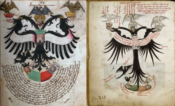 Alchemical Symbolism The Crucified Christ-Eagle. Back to alchemical symbolism index The Buch der heilgen Dreifaltigkeit is a complex document, part a work of historical prophecy and part an alchemical text. The core of its alchemical message lies in drawing a parallel between the Christian idea of the redemption and the alchemical process. We have seen something of this in our discussion of the two hermaphrodites - the Luciferic and the alchemical. There is a particular image in the Buch der heilgen Dreifaltigkeit, that of the Crucified Christ Eagle, which explains the ideas underlying the alchemical message in the manuscript. I show here the versions in the Munich and the John Rylands manuscripts. Here we see a two headed black winged eagle set on top or conjoined with the image of Christ crucified. Christ here bears the crown of thorns beneath his golden crown and we see the stigmata on his hands and feet. His belly which has the blood of the fifth wound can be seen between two crowns. In the Munich codex these are coloured green and black. His feet rest on a strange two headed man without limbs, the left side of his body being green while the right is red. Above the feet of Christ are set two crowns, that on the left being black, while on the right is of a silvery colour. Above Christ's crown, which in the Munich is presented in a circle of gold leaf, is a three headed eagle like bird, here grey but likely to have been silver leaf that has tarnished over the six centuries since its creation. The illustration is entitled 'fforma speculi trinitatis' (the figure of the mirror of the trinity). The text, details of which one can glean from a book by the scholar Barbara Obrist, indicates that Christ both as a man and as God is to be identified with quicksilver. Quicksilver contains all the metals, and these can be given the names of the seven virtues, and these virtues appear in the crucified Christ. We thus see seven crowns here set around or on the body of Christ. We saw the opposite with the Luciferic Androgyne which also had seven crowns, but these were associated with the seven deadly sins. The text presents a table of planetary colours and correspondences which link to the seven crowns.:- Jupiter - Chastity - Tin - Grey Saturn - Sobriety - Lead - Black Moon - Charity - Silver - Blue Mercury - Sanctity - Quicksilver - White Venus - Piety - Copper - Green Sun - Purity - Gold - Yellow Mars - Humility - Iron - Red The eagle is here being crucified along with Christ and the text identifies this with the base metal lead. The text states "All good medicines are brought about by the suffering of God: the eagle was black as he hung on the cross with the seven virtues, but he ended as a golden eagle in eternal glory". The text also indicates that Christ crucified is symbolised by the black sun and the three headed eagle hovering above his head is called "God, the eternal light, the black sun with three necks". (We remember that in the Christ myth, a solar eclipse occurred at the crucifixion.) The text set in a semicircle under the crucified Christ eagle, states that the trunk of Christ must be constituted of calcined copper and that Christ is then transformed by his own power into gold. The mystical suffering of Christ is paralleled with the processes of mortification, calcination and purification. The copper vitriol (his belly) must be distilled seven times "So kill this mercury seven times, always with fresh vitriol, and let it also ascend seven times: God took seven death sentences on his body for us, so that his whole body is dead, bloodied by blows". Although not symbolised in the figure, the text at this point refers to the mystical theme of the two liquids, water and blood, which flow from the heart of Christ. The text beside the two headed figure in the Rylands manuscript, on the right above appears to say "David sobrietas, Dies Saturni" and "Jesse caritas, Dies Lune". Other parts of the emblem, have other of the seven virtues associated with them. We see that is almost impossible to make sense of this image without referring to the text. Sadly, the Buch der heiligen Dreifaltigkeit remains untranslated and few can read its 15th century German.