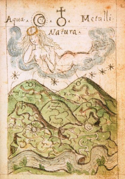 Alchemical Symbolism Drawing from Neri manuscript. Back to alchemical symbolism index Back in the 1990s I was lucky to be able to research, in some depth, the alchemical material in the Ferguson Collection in Glasgow University Library. Among the many items there I remember the alchemical notebook of Antonio Neri (1576-1614), the author of the famous treatise on glass (Arte vetraria). One of his notebooks on alchemy from 1598/99 has survived which has many recipes and remarks on alchemy and a wealth of pen drawn coloured illustrations - there are about 60 spread throughout the text. One of these has recently come to my attention. It shows the seven hills of the planetary metals with streams or perhaps veins, leading down to a river in the foreground. High in the sky we see the figure of Nature, flying in a cloud. She squeezes her breast and expels seven stream of her milk which become the veins of the metals in the earth.