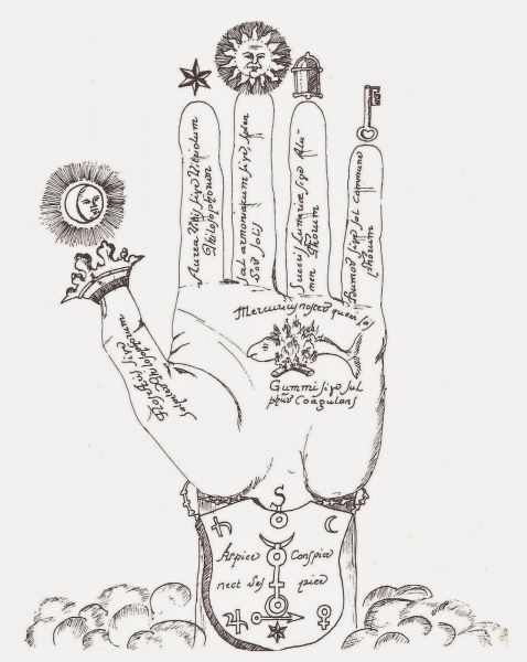 Here is another variation of the alchemical hand. Here the fingers bear the conventional symbols of the relevant substances. This also has an interesting diagram of symbols, set above the Moon, forming a little pentagon, though rather irregular in shape.