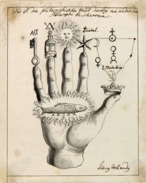 Alchemical Symbolism The Hand of the Philosophers. Back to alchemical symbolism index The emblem of the hand of the philosophers' should be quite familiar as it is often used in modern books on alchemy. This was originally an illustration in Isaac Holland's book Die Hand der Philosophen. The writings of Holland, who cannot yet be unidentified with a definite historical person, appeared at the end of the 16th century, and were revived in the mid 17th century and reprinted a number of times up to the end of the 18th century. The images placed on the hand are evocative, and it is tempting for people to interpret these through their present day belief systems, however, the author has left us a clear statement of their meaning. This is from his book Die Hand, of 1667. Below I show, on the left, the engraving from 1667 and, on the right, that from the 1743 version of the work. Those who have not this Hand and do not understand its secret signs... they do not possess the philosophers' treasure. In this Hand is locked the secret of the philosophers, that is, of the seed and the earth, as will be told later. Thumb. First look at the thumb on which a crown stands below the quarter moon. By this is meant saltpetre. For just as the thumb vigorously finishes off the hand, saltpetre does in the alchemical art, for he is the King and Lord of all salts. He is the mill through which everything must be ground. Index finger. The second sign and secret of the philosophers is the star with six points, standing above the forefinger next to the thumb. It is compared to Roman Vitriol, because no work that is to be perfect can be completed without vitriol, for it is the greatest and strongest salt after saltpetre. Middle finger. The third sign is the Sun standing above the middle finger. By it, Sal ammoniac is designated, for, apart from saltpetre and vitriol, nothing more powerful is found. Ring finger. The fourth sign of the philosophers is the lantern standing above the fourth finger of the Hand, whereby alum is indicated. For without alum, no perfect work can be accomplished, because it is required for the red and the white. It has an astonishing nature and a most subtle spirit. Little finger. The fifth secret and sign is the key of the philosophers, standing above the little finger. Simultaneously, it is the lock of the Hand. That is why the key is standing on it. By it, common salt is designated, for salt is the key in this art. Middle of the hand. The sixth secret sign is the fish. It stands in the middle of the Hand and signifies Mercury, for without Mercury or the fish nothing can be done. He is the beginning, the middle and the end, and he is the priest who must marry everything. He is the male and the seed; he is the water out of which all metals have originated; and he is the principal factor of all arts, and the greatest of all secrets. Palm. The seventh sign of the philosophers is fire. By this Sulphur is indicated. It is the earth and beginning of all metals. It is the female who brings forth the fruit. For no seed can grow unless it be first thrown into fertile soil. Then beautiful fruit will come from it. Thus it also happens that when a pure Mercury is joined to a pure Sulphur, this brings forth pure fruit. Thus, they are man and woman, father and mother, fire and water, seed and earth.