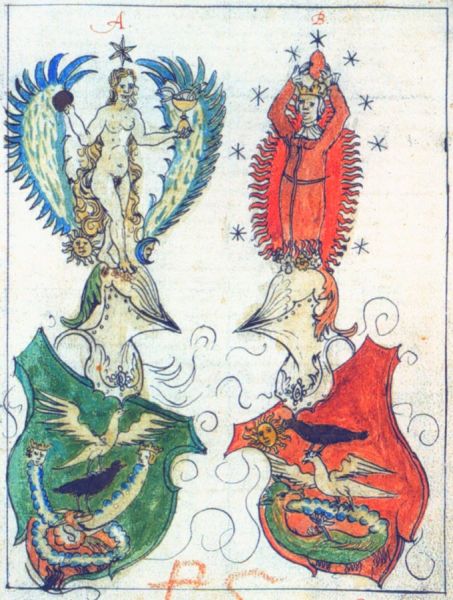 Alchemical Symbolism Heraldry in the Book of the Holy Trinity. Back to alchemical symbolism index Das Buch der heiligen Dreifaltigkeit (Book of the Holy Trinity) is among the first alchemical manuscripts to incorporate emblematic imagery. It dates to the early decades of the 15th century, around 1420. It has a series of alchemical figures among which two have some connection to heraldry. I show here one of the figures from a later version in a 1550 manuscript in Basel. In 1582 Hieronymus Reusner issued his influential book Pandora, printed in Basel. This was illustrated with a series of woodcuts and it seems obvious that these were taken from the imagery in this Basel manuscript. ![]() It shows in parallel two symbolic coats of arms labelled A and B. Reusner's text commenting on these at this point is instructive. Of the figure on the left he says "Here the fixed has been made volatile, the water that remains is the mother of a stone". Of the rightmost one "Here the volatile has been made fixed, the medium of the philosophers is the father of a stone". Each of these presents a conventional heraldic device such as were used in 15th century German heraldry, with a shield, a helmet and the crest (the image that stands above the helmet). Firstly, let us look at the crests. That on the left shows a female figure standing within a pair of wings. At her feet are the Sun and Moon and she holds in her hand a chalice with three serpents and a round globe in the other. Above her head shines a white star. On the right we have a red king standing in a nimbus of flames and holding above his head a red egg like form. Around him are set nine stars. The helmets are conventional, that on the left having a crest of green fronds, while the rightmost has a red crest. The imagery on the green shield quotes from that in an earlier drawing in the series which shows a dragon with open mouth standing in the circular space, somewhat like a ring, created by a strange two headed snake, with a crowned head at each end of its body. In the Reusner woodcut these heads are labelled as man and woman, while the dragon is called the Mercury of the metals. On top of this two headed snake stands a black raven and standing on this is a white bird taking flight. The Reusner commentary here states :- The green shield show us, The original art of the men of philosophy. In that way they have accomplished, The Raven which flies by night. When we examine the shield on the right, which has a red ground, we find something familiar. We have already seen this particular grouping of imagery in our posting on the 'Alchemical image in a German almanac'. Here we have the winged dragon on its back seizing its own tail. This is set on flames. Standing on top is a white bird, and perched on the bird's head is a black bird. It reaches out to peck at a sun. Reusner's text here states:- By means of the red shield you shall recognise Hermes' bird, which I am declaring to you. It is called the white eagle, Well known to many philosophers. This emblem demonstrates a point I have been trying to make for some decades, that one should never rush to interpreting an alchemical emblem. These rarely stand alone, but are part of a long tradition of alchemical imagery. The context for many such emblems goes back hundreds of years. Thus our German almanac image must be seen as emanating from the earliest phase of alchemical imagery. Most modern commentators on alchemical imagery have no idea about this, but merely project their own preconceptions into their 'interpretation'. Sadly, Das Buch der heiligen Dreifaltigkeit, remains untranslated and can only be read by those familiar with early 15th century German. Its text would be very instructive. Here is the corresponding woodcut from Reusner's Pandora, 1582. ![]() |