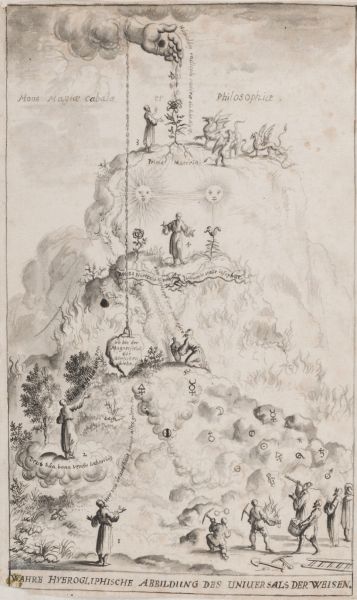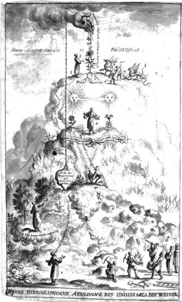 I will just outline the text and give some indications about the emblem itself. It is entitled at the bottom "The true hieroglyphic figure of the universe of the Wise". It depicts "the mountain of magic, cabala and philosophy" and presents a number of emblematic scenarios. Above the mountain the hand of God emerges from the clouds and from its fingers drops of liquid fall down onto the mountain top. This is labelled "The radical moisture of Nature, one light of Fire and Water." The idea of 'radical moisture' arises from Greek medicine, as transmitted in medieval Arabo-Latin medicinal manuscripts, and seems to refer to a moisture innate to living beings, a kind of watery life force. This radical moisture falls upon and appears to nourish a plant growing on the summit. This is labelled "The prima materia". On the right are three winged dragons, while on the left is the figure of a philosopher who gazes on the scene. He is the observer of all the actions on the various tableau in this emblem. Beside him is the number '3'. We will see him again bearing the numbers 1 to 5. A path leads upto the summit from a lower summit upon which we see again our philosopher '4'. He stands between, and gestures towards, a rose on the left and a lily on the right. Below this is a label with the words "Rosa hierochuntis", which is the Rose of Jericho (known as the resurrection plant), and "Lily in the Valley of Josaphat", which is an other biblical reference to a plant associated with resurrection. Below this is yet another summit on which again our philosopher observer stands, here labelled '5'. He holds a pitcher and appears to be collecting water or liquid which flows down in a stream from the root of the rose. He is saying "O Jesus, I wish that you take all of me." At this point another connection is being made with the Hand of God in the heavenly world, for we see that there is a cord around God's wrist from which is suspended a large triangular stone. This bears the text "I am the magnetic Stone of the Divine Love." At the base of the mountain the Philosopher here labelled with a '1' stands with his arms outstretched viewing the scene. He says "The hand of the Lord gives all good things." On the lower part of the mountain to the right we see a group of miners. They examine and work with pickaxes the ores of substances in the mountainside. These are the gifts of God just mentioned. Here we have the alchemical signs for Mercury, Silver, Antimony, Salt, Vitriol and other substances important in alchemy. Our philosopher also can be seen in a cloud a little above his appearance at point '1'. He is now at point '2', where he says "Nothing is possible without God". The cloud on which he stands is labelled "By labours, God himself offers good things." I have here read this emblem from the top to the bottom as this is easiest to grasp, but it seems the emblem maker intended us to read it through the five stages. The first stage is the philosopher in the foreground gazing up at the mountain. He is lifted in a cloud and ascends to the top of the mountain where he finds the prima Materia. He then comes down the mountain, first stopping at the Rose and the Lily, both here associated with resurrection ideas. The red rose and the white lily are often emblematic of the two tinctures in alchemy, and we might assume this is what is intended here. He collects an essence from the root of the red, rosy, tincture, thus achieving the goal of the alchemical work. |