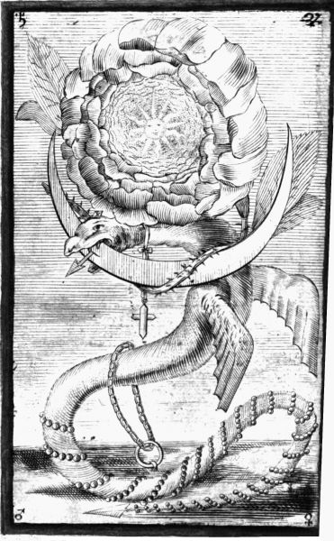 The emblem presents us with a strange winged dragon which has been held down to the ground by a chain fixed to a ring. The dragon manages to raise itself and bites at the crescent Moon. Set above the Lunar crescent and atop the neck of the dragon is a large rose which has the Sun at its centre. Wound around the tail of the dragon is what appears to be a string of pearls or gems, while hanging from its neck a ribbon is tied with a pendant seemingly composed of two gems forming a cross. We can surmise that the winged dragon is Mercury (the one planetary metal not explicitly depicted here). This mercurial dragon contains in itself the much valued treasure of the gems and pearls. It is, however, tied to the earth and restricted. One would have to read the book in order to decide as to whether this tying down of Mercury was the key to the alchemical work, or if the transmutation was here being held back, and the role of the alchemist was to free this dragon.
