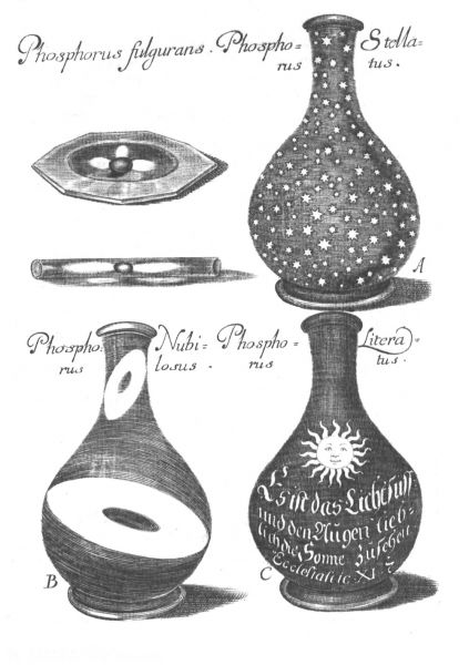 During the latter part of the 17th century the discovery of phosphorus intrigued and challenged the established ideas of alchemy. Suddenly, alchemists were able to prepare a substance which shone in the dark and often spontaneously burst into flame. A number of books were written on the subject. Here is an interesting engraving from Johann Sigismund Elsholtz, De Phosphoris observationes, Berlin 1681.