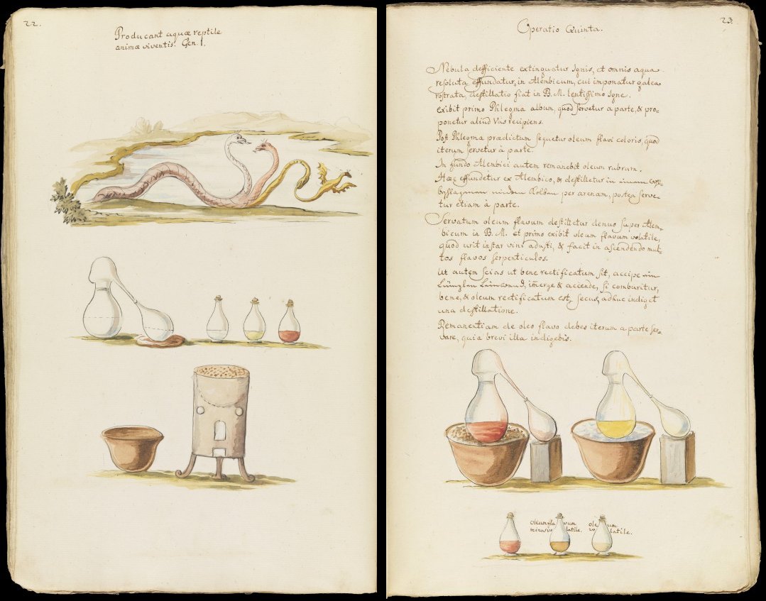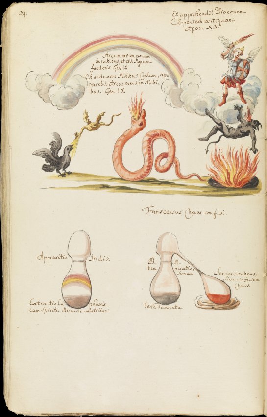 Alchemical Symbolism Symbolic and physical alchemy. Back to alchemical symbolism index The Wellcome Library in London has a significant collection of alchemical manuscripts. Among the many important items is the little known early 18th century manuscript, Wellcome MS 4775, entitled Thesaurus Thesaurorum et secretum seecretissimum. We will see this as being almost unique among alchemical manuscripts as it ties together the emblematic depiction of alchemical process with the physical laboratory work. Many of the pages of this manuscript are to be seen as divided into two levels, and upper level where there is an emblematic expression, and a lower one in which simple laboratory processes are shown. It is obvious that these are two ways for describing the same alchemical reality. In most alchemical manuscripts we either have drawings of alchemical apparatus or emblematic pictures. Different alchemists were drawn to use either physical images or allegorical emblems, and rarely do we see the two in parallel. Wellcome MS 4775 is thus very special, in that it gives us an insight into these two parallel descriptions of the alchemical process. I will show here two images. The first shows three headed serpent beside a pool. One head is white, one red and the other yellow. From the yellow head emerges a little flying yellow dragon.