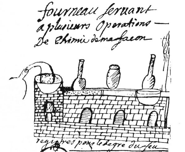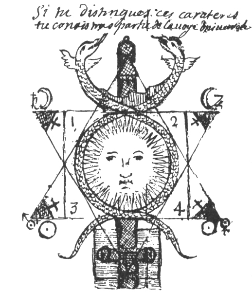 Alchemical Symbolism Pen Drawing in Vatican manuscript Ottoboni Latini 3032. Back to alchemical symbolism index Here is an interesting pen drawing from a French manuscript in the Vatican Library MS. Vaticani Ottoboni Latini 3032, by Jaimmes De Monroignot, dated 1709. This is a work partly devoted to practical workings. One of the sections has some drawings of furnaces and other apparatus but is preceded by this drawing. The text in French states "if you are able to distinguish these characters you will know the most part of the universal way." ![]() The image unites a square, 1-2-3-4, upward and a downward pointing triangles, a central pillar, a caduceus of two intertwined snakes with the bright sun in its central space and a dark crescent moon in the top section. The corners of the two triangles have the planets. Saturn and Jupiter are at the top of the downward pointing triangle, while Mars and Venus are at the base of the upward pointing one. Each of the internal angles of the vertices has what appears to be a sulphur symbol. Two moon symbols are seen along the base of the downward pointing triangle, while two suns are on the base of the upward one. The central pillar around which all these symbols have been carefully positioned seems to be founded, or supported on a dark hatched square. The base of this pillar appears to form a cross, with three suns on the limbs of the cross. This is a fascinating and quite complex image. Other illustrations in the work appear to refer to the four grades of fire and the square has the numbers 1-2-3-4 at its corners. The next drawing from the Vatican manuscript shows four degrees of fire set out in a row. Here these would appear to be a water bath, sand bath, indirect heating in a furnace and direct heating.